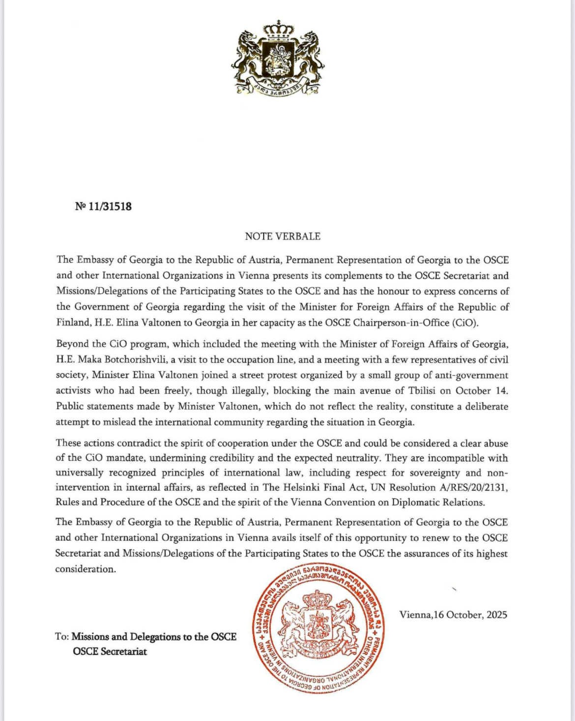 „საქართველოს საელჩო ავსტრიის რესპუბლიკაში და მუდმივი წარმომადგენლობა ეუთო-სა და ქ. ვენაში სხვა საერთაშორისო ორგანიზაციებში გამოხატავს თავის ღრმა პატივისცემას ეუთო-ს სამდივნოს მიმართ და აქვს პატივი, გამოხატოს საქართველოს მთავრობის შეშფოთება ფინეთის რესპუბლიკის საგარეო საქმეთა მინისტრის ელინა ვალტონენის, როგორც ეუთო-ს მოქმედი თავმჯდომარის საქართველოში ვიზიტთან დაკავშირებით.