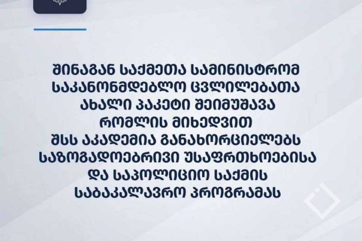 „უმაღლესი განათლების შესახებ“ საქართველოს კანონსა და სხვა თანმდევ საკანონმდებლო აქტებში შესატანი ცვლილებები პარლამენტს განსახილველად უკვე წარედგინა. პოლიციის აკადემიის სამწლიანი საბაკალავრო პროგრამა პირველად შეიქმნება და მისი შემადგენელი ნაწილი იქნება ფიზიკური, ტაქტიკური და საცეცხლე მომზადება, სპეციალური სასწავლო საგნები საზოგადოებრივი უსაფრთხოებისა და საპოლიციო საქმიანობის შესწავლისთვის.